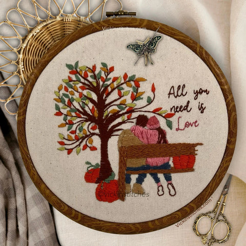 Hand Embroidery Pattern featuring an autumn hills scene with cabins and various autumn colored trees