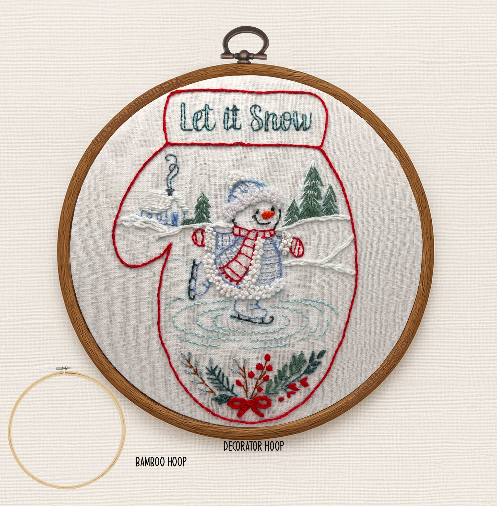 8” hoop design 🌿🧵 Capture the magic of winter with this joyful “Let It Snow” mitten design featuring a cheerful snowman gliding across the ice. Surrounded by snowy trees, cozy cabins, and festive greenery, this piece is as heartwarming to stitch as it is to display. Beginner-friendly and delightful for experienced stitchers too — perfect for holiday décor, handmade gifts, or seasonal displays.