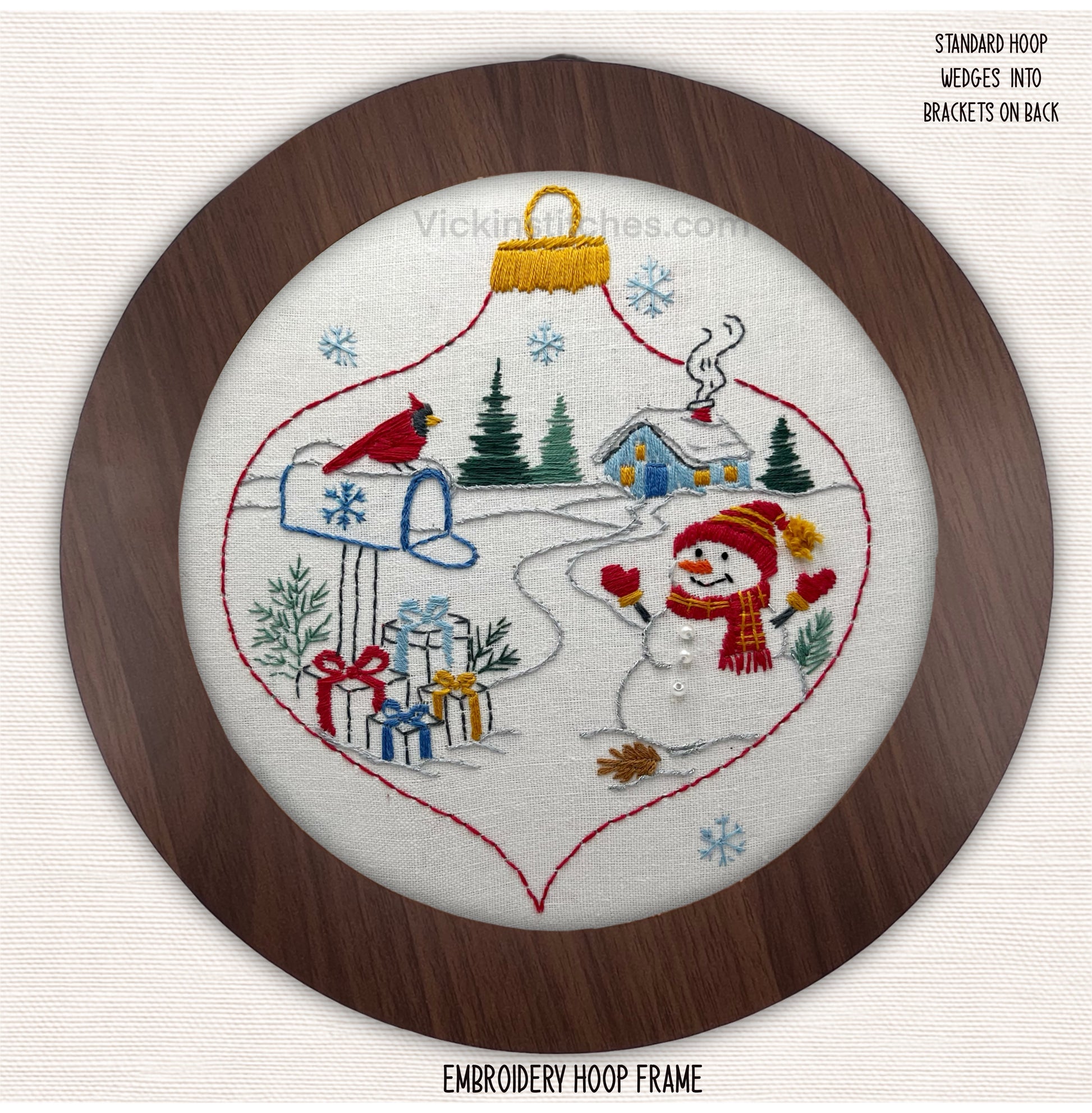 8” hoop design 🌿🧵 A delightful winter wonderland tucked inside a classic ornament shape — complete with a cheerful snowman, cardinal on the mailbox, cozy cabin, and wrapped presents along a snowy path. This nostalgic design is perfect for stitchers of all levels and makes a beautiful handmade keepsake or holiday gift. ❄️⛄✨displays.
