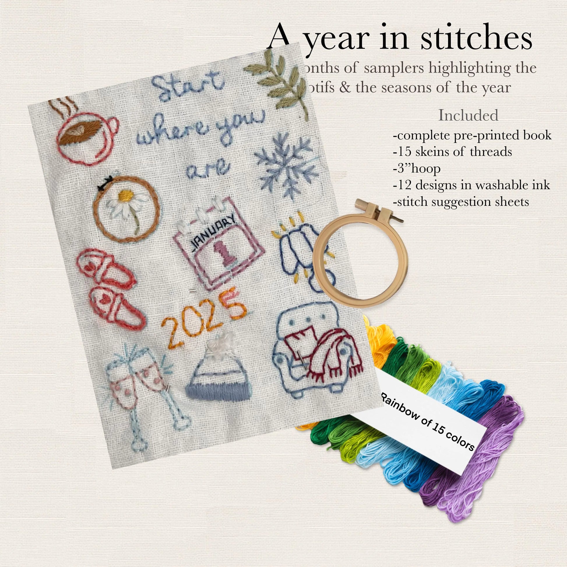 A Year in Stitches – 12-Month Embroidery Sampler Book Kit