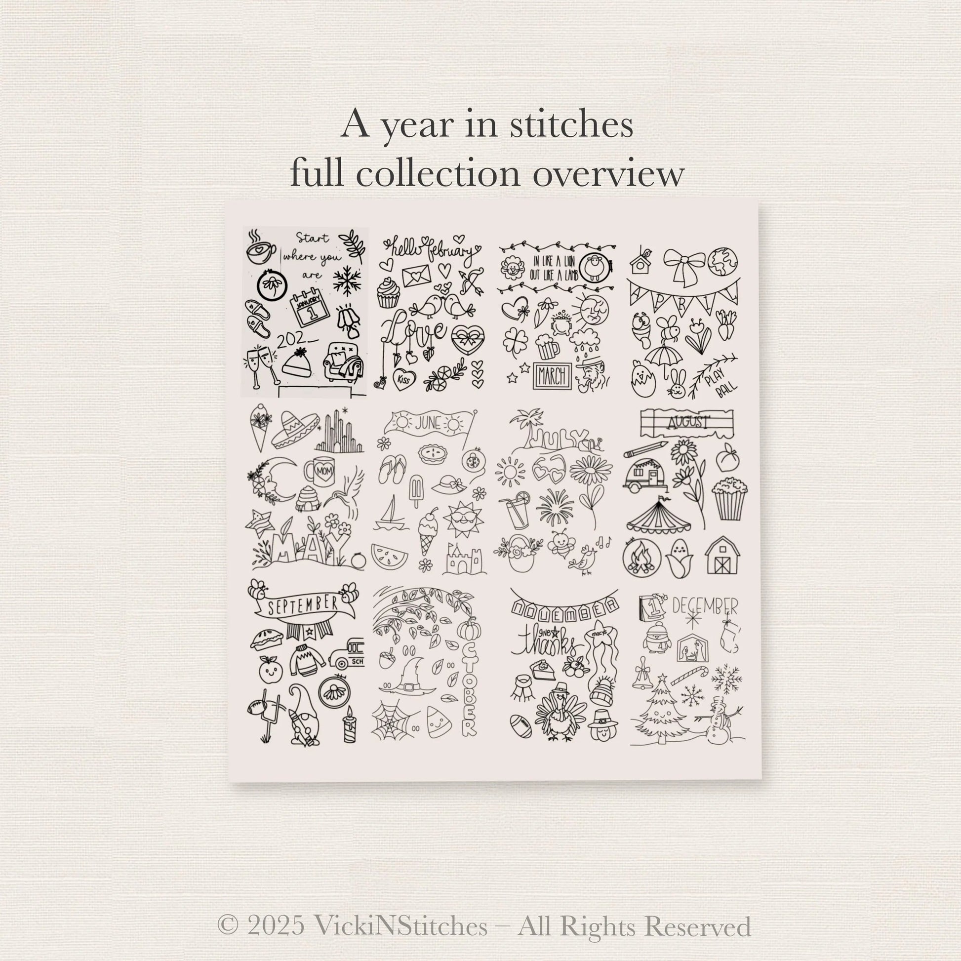 ✨ Celebrate creativity all year long with this A Year in Stitches embroidery book — a full 12-month collection of charming sampler pages that capture the motifs and moods of every season. From cozy winter stitches to sunny summer scenes, each page is pre-printed and ready for you to bring to life one month at a time.