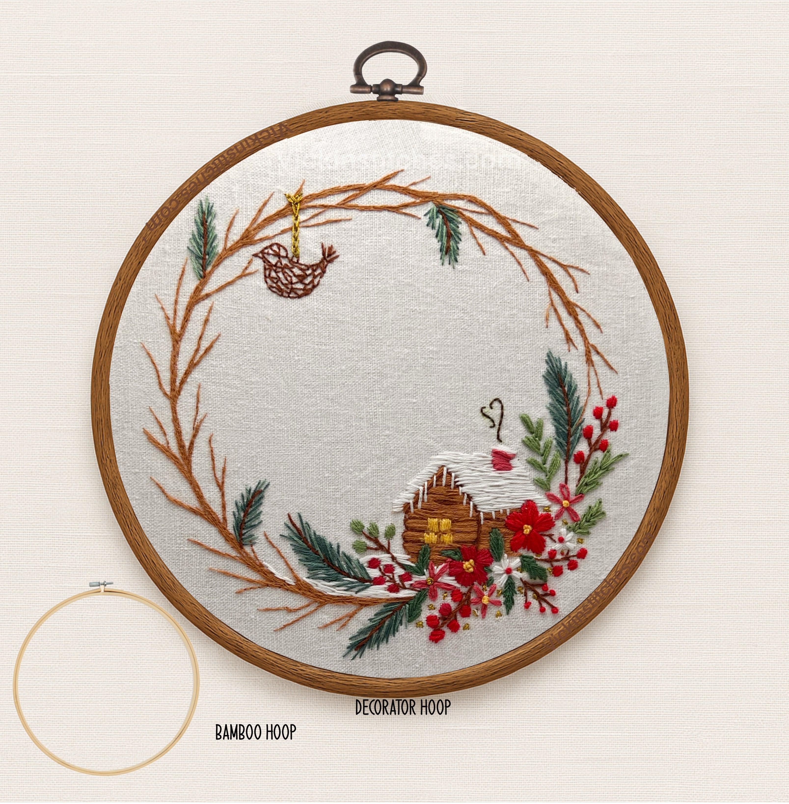 - Christmas Cabin Wreath Embroidery Kit | Rustic Floral Winter Scene | H
