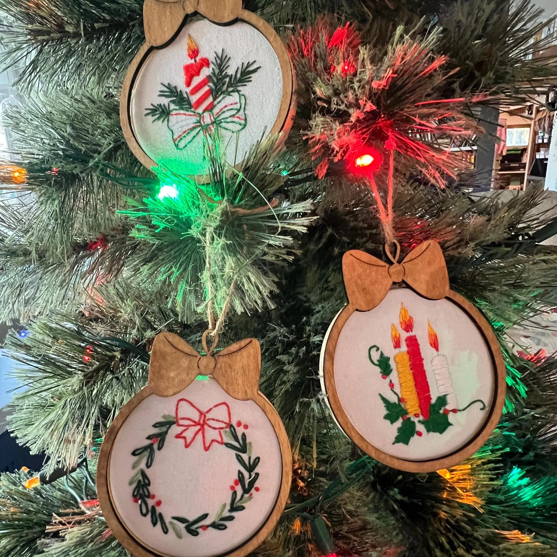 Christmas ornament Embroidery Kits with frame overlay. Mini Christmas tree ornament diy k/its. Christmas Trees embroidery. Embroidery gifts.